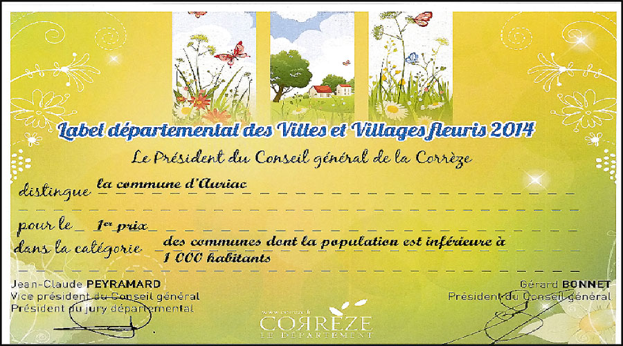 Auriac a obtenu le Label Départemental des Villes et villages fleuris 2014 décerné par le conseil Général de la Corrèze.